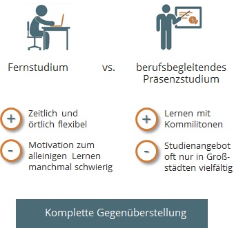 Wir listen nachfolgend getrennt die Studiengänge beider Varianten auf. Wenn Sie sich erstmal generell einen Überblick über die Unterschiede von Fern- und Präsenzstudium machen wollen, empfehlen wir die komplette Gegenüberstellung beider Studienformen.
